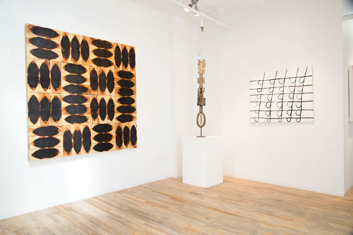 Left to right: Willie Cole, Procession, 2006, scorched plywood; Mossi Antelope Dance Mask, Burkina Faso, eood and pigment; Bettina Blohm, Diagram in White, 2014, oil on linen.